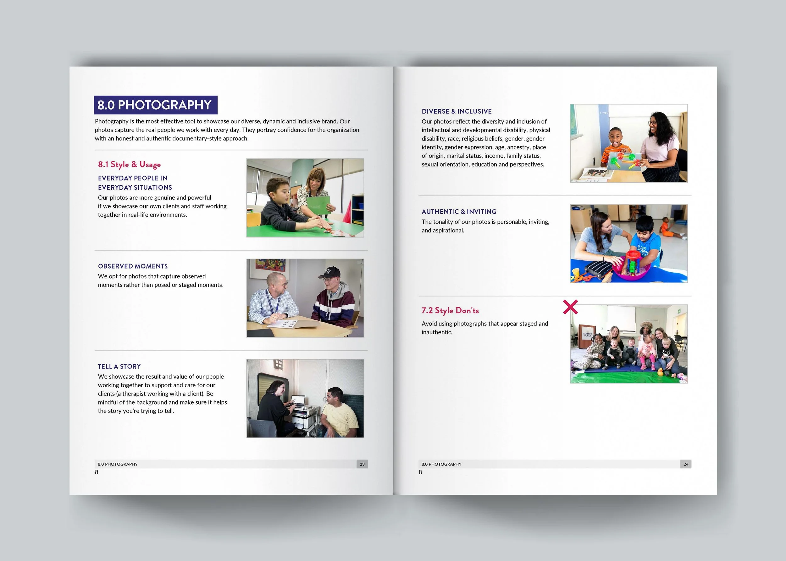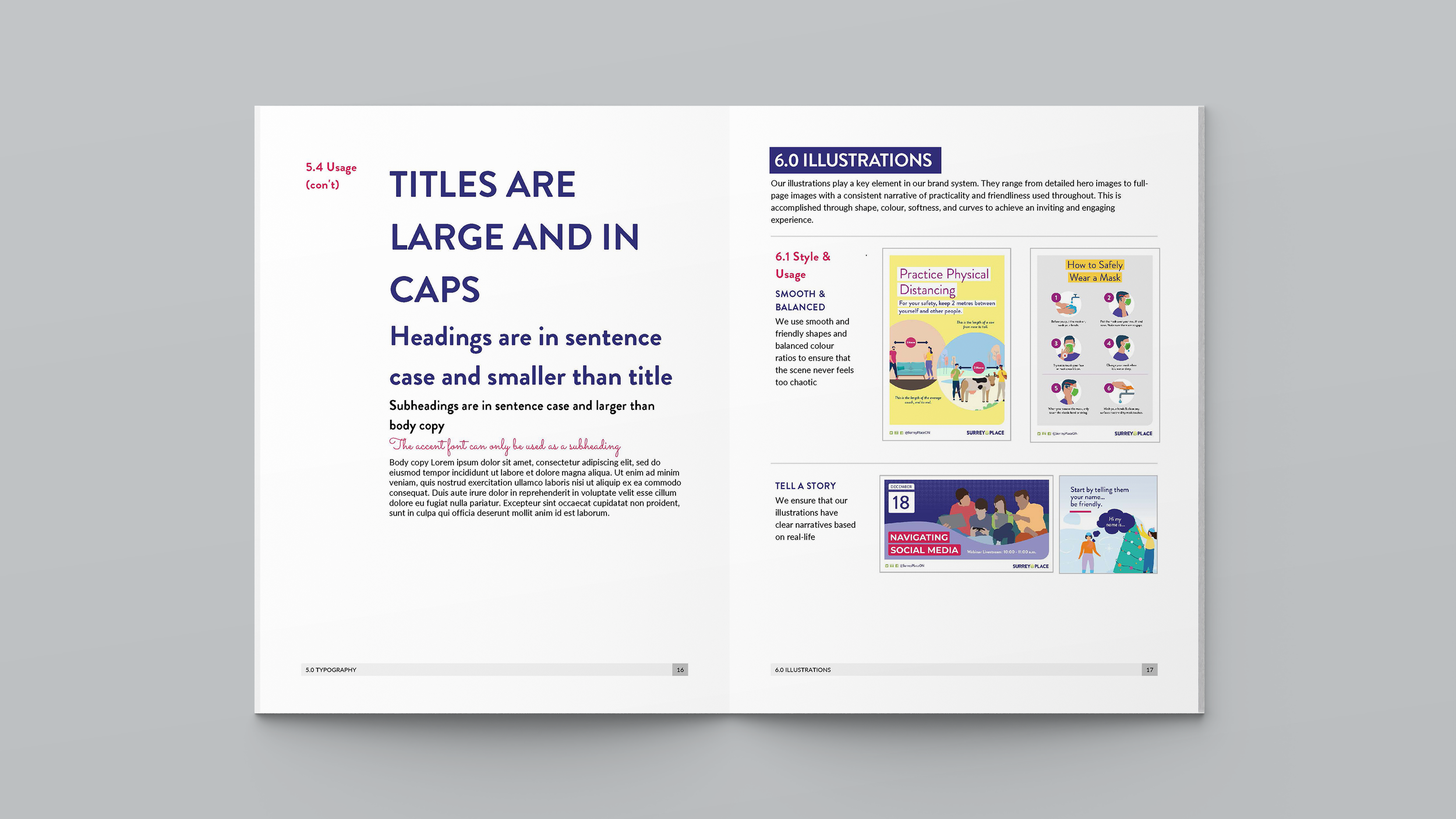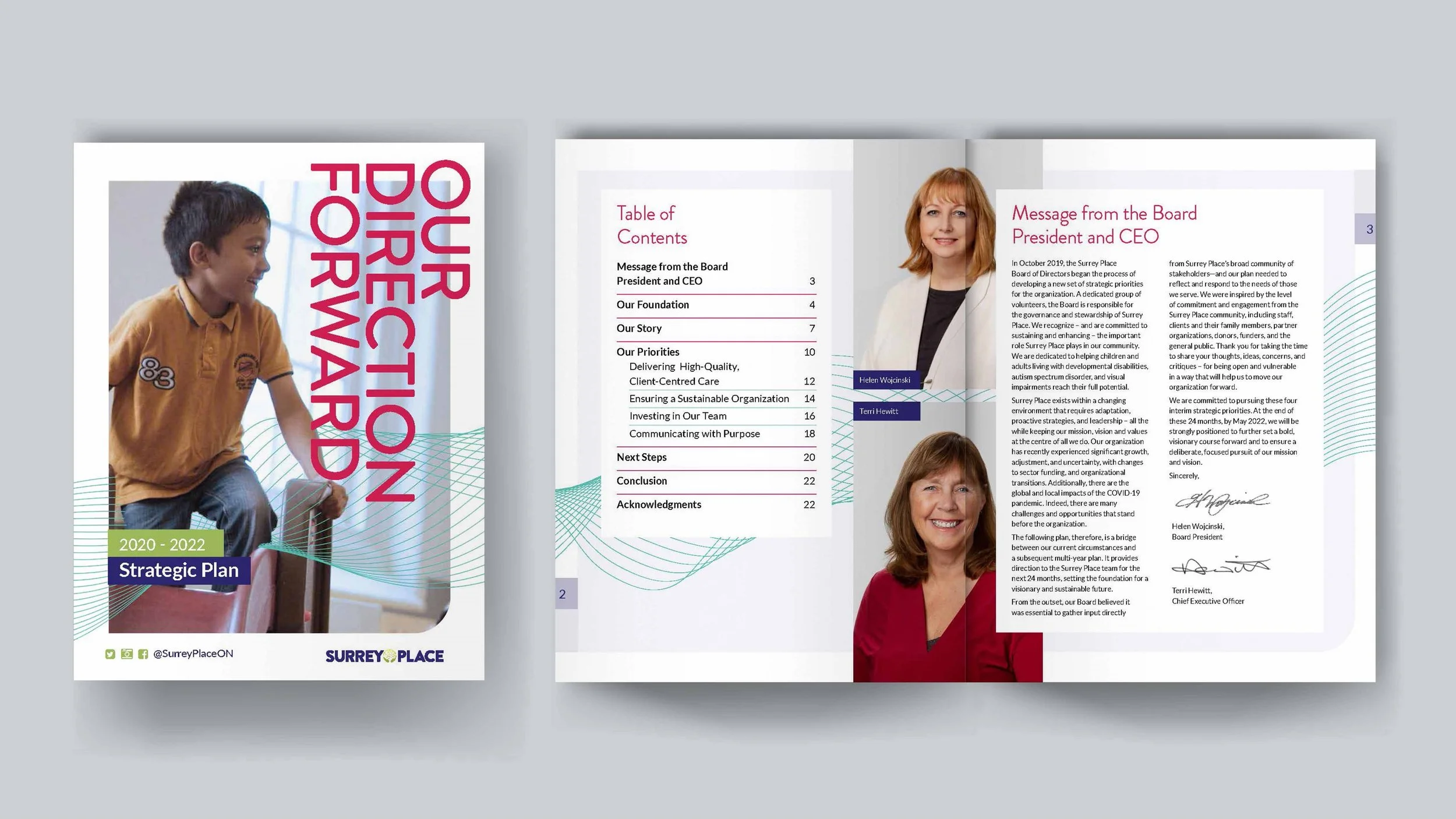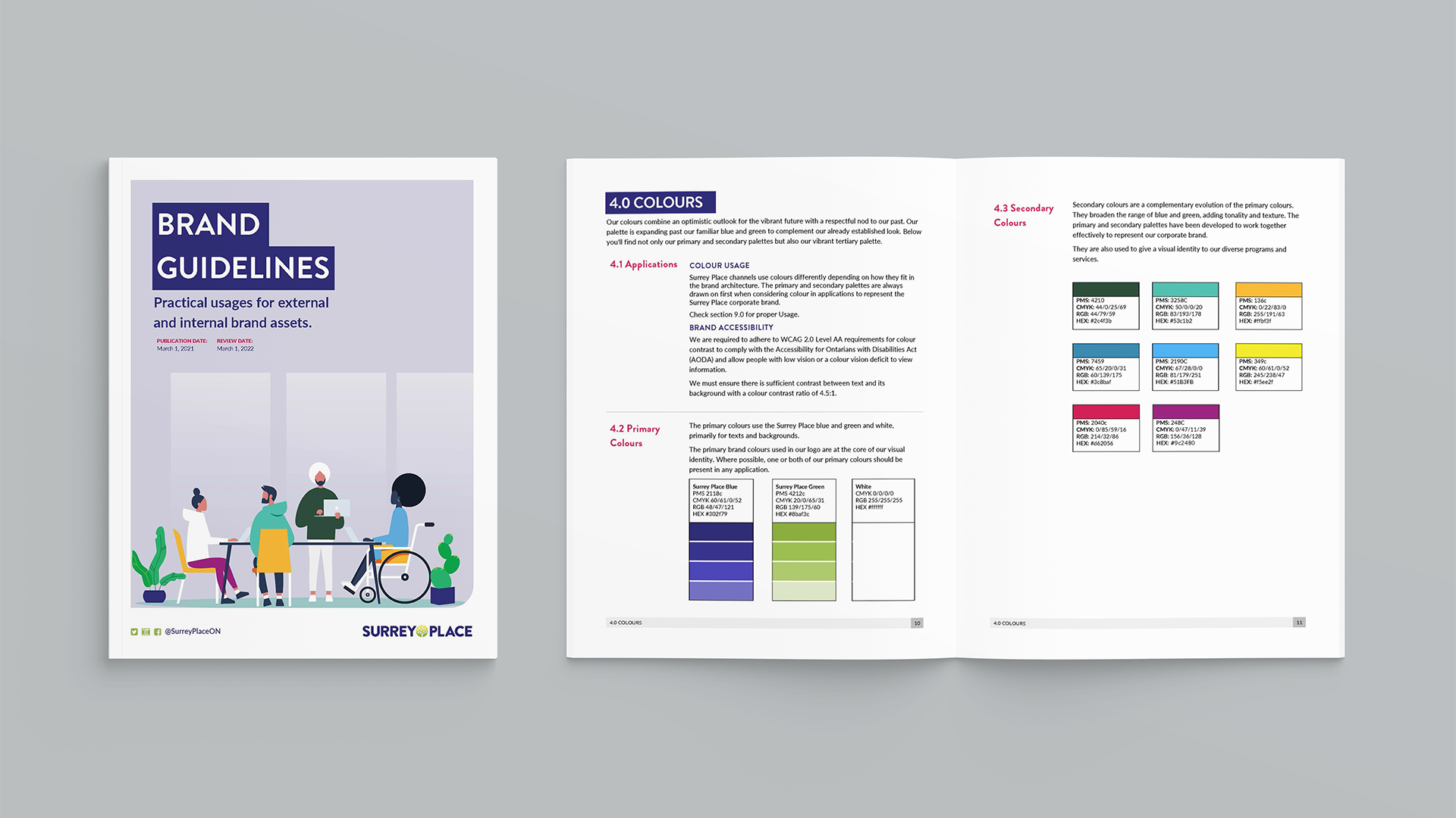 Surrey Place’s original identity was limited in scope, consisting of only two colours and a few logo variations. We expanded the visual palette to include fresh colours, fonts, imagery and distinct sub-brand identities, capturing the diversity of the agency’s services and community.